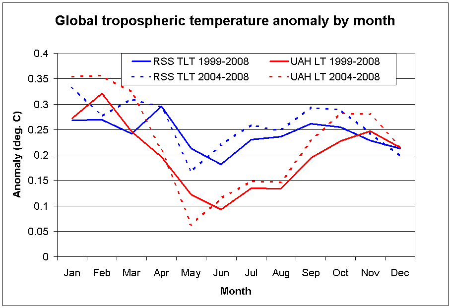 Update (April 9, 2008): The March LT global temperature anomalies are out and they show both RSS (0.17) and UAH (0.21) down from February. The divergence has narrowed from 0.12 deg C in February to 0.04 deg C in March, which is exactly the divergence seen for that month in 2004-2008 (see below). So far in 2009, the UAH annual cycle is alive and well.