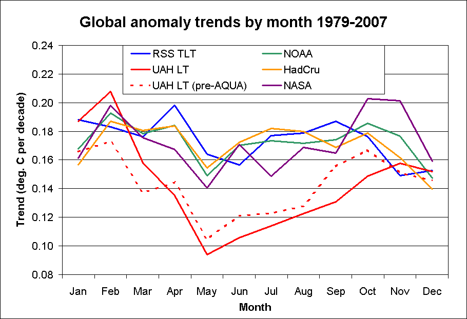 In other words, RSS has to make a correction for diurnal drift, while UAH does not. But a comparison of the UAH pre-AQUA LT data set to 2007 with the current data set for the same period shows that the UAH seasonal divergence is stronger now than it was before the change!