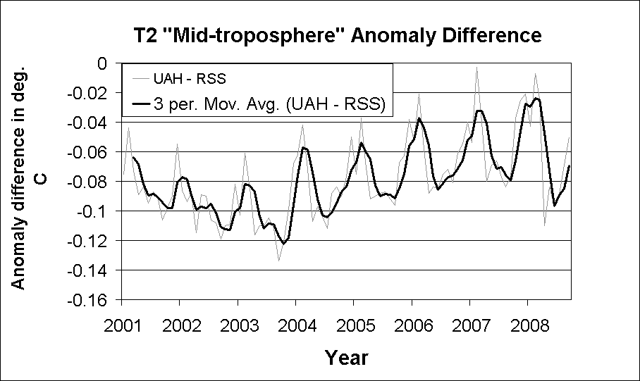 To summarize, there is a severe annual cycle in the UAH LT data set that results in a noticeable divergence in both the global and tropical monthly temperature trends over the 1979-2008 period. This annual cycle and resulting divergence can not be explained by diurnal drift adjustments in the UAH or RSS data sets. Rather, it appears that a moderate annual cycle (of hitherto unknown origin) in T2 channel data has been exaggerated by the UAH LT extraction process.
