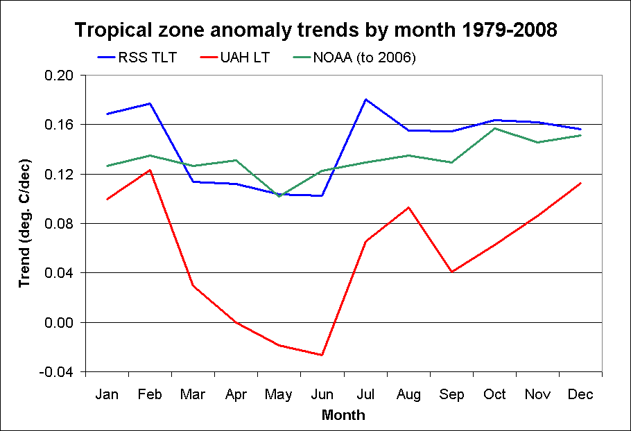 As noted previously, the UAH tropical trend is lower in all months. And there does seem to be a modest seasonal variation in RSS that is not present in the surface data (NOAA).