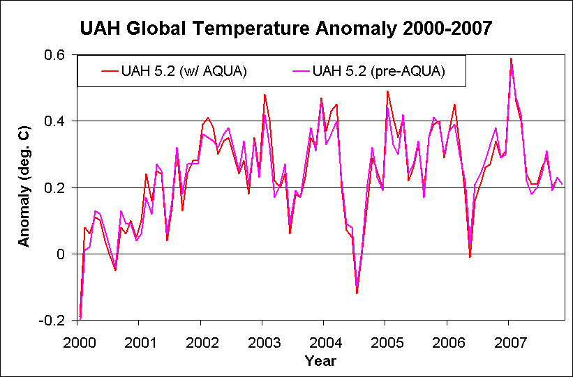 I have obtained a copy of the UAH LT data set as of November, 2007, before the merging of AQUA data ( many thanks to cce for sending the data). This archived data set permits comparison of the recent UAH 5.2 data to the pre-AQUA version (also dubbed 5.2) over the 2000-2007 period.