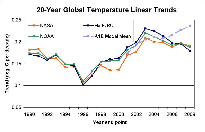 [Revised (May 8)] Using the standard 0.2 deg. per decade benchmark, Lucia’s A1B multi-model mean trends, the 20-year trends were ahead of the IPCC projection earlier this decade, but now are substantially below as of 2008. Certainly such fluctuations are to be expected with the larger interannual variability of the “real” climate compared to the models. (For comparison, look at Lucia’s original post here; it shows the model trends way above the observations; the difference is that Lucia used the “volcano” subset, which is a good 0.04 deg C higher in the critical 2006-8 period .)