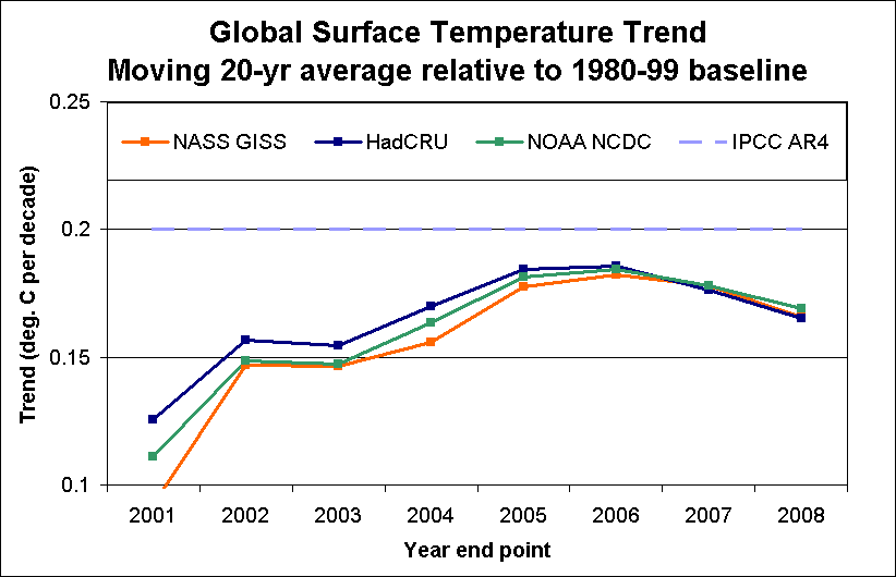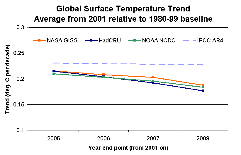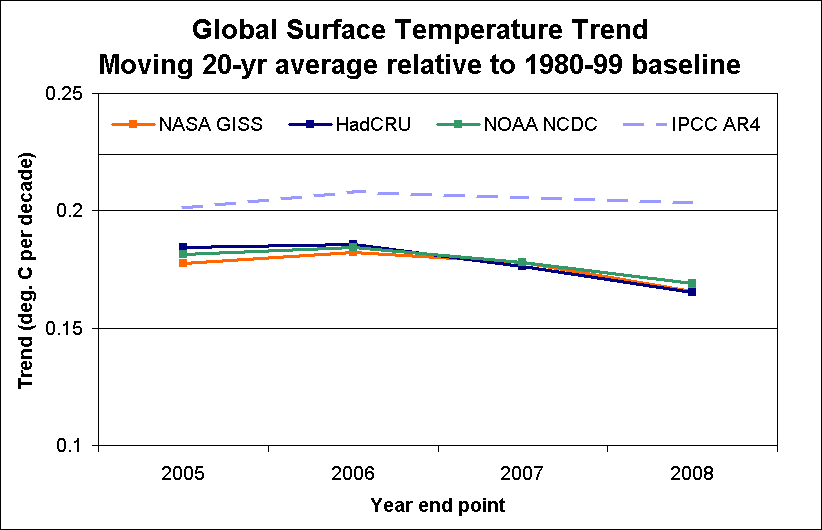 [Yes, I agree that I should have made the calculation method clearer. Each trend is the difference between two averages (not a single point). So to take the GISS 2008 example, I take the difference in average between 2000-8 and 1980-99 baseline, and divide by the elapsed time centre-to-centre. The centre of the projection period is 2004 and that of the baseline 1989.5, for an effective elapsed time of 14.5 years. In this case, the difference is 0.26 deg/1.45 decade = 0.18 deg. decade.]