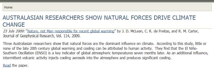 In contrast with the claim of the first NZCSC release, entitled “Nature, Not Man, Is Responsible For Recent Global Warming”, the latest headline backpedals somewhat: “Compelling New Research Shows Nature Rules Climate”. The news item announcing the latest press release has the rather illogical title “Three Australasian Scientists Find AGW Link To Southern Oscillation”.