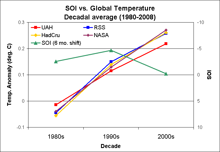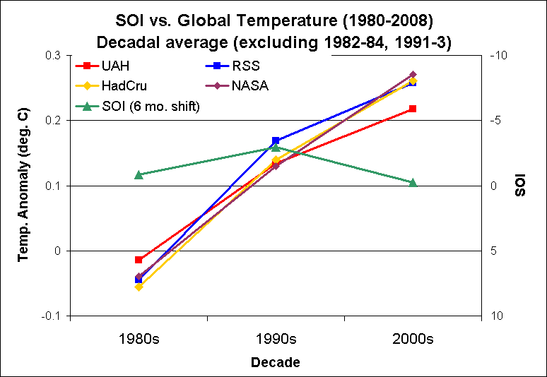 Even if we remove the years of significant volcanic cooling, there is still no evidence of a dominant ENSO influence on temperature trends. The most that could be said is that variations in SOI may have had a slight dampening effect on warming in the tropospheric data sets, but even thatsmall effect is not evident in the decadal surface record.