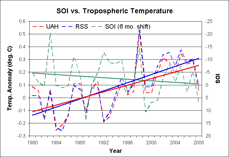 I skimmed Lucia’s post at The Blackboard and was wondering if your chart of declining SOI and rising temperature trends is the graphical representation of what she was talking about with the 4.2C/century temperature trend discovered by McLean et al.
