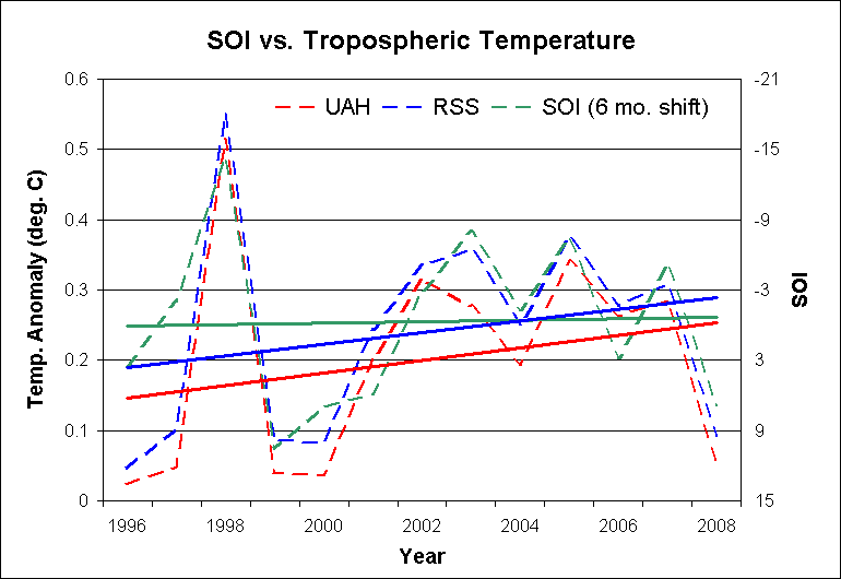 First we’ll consider the recent period 1996-2008, which is free of major volcanic influence. This is the period in which McLean et al claimed to diiscern “similar” trends for SOI and mean global tempertaure. Recall also their related claim in the latest press release that their results “clearly showed that SOI related variability in MGT is the major contribution to any trends that might exist.” [Emphasis added].