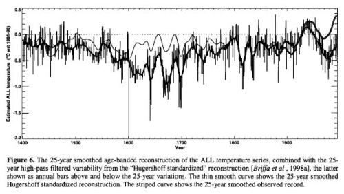 But the actual paper, far from using manipulation (undisclosed or otherwise) to force a match between post-1960 MXD data and temperature, examines the effect of different combining techniques on the full time range of the series, up to 1994, clearly showing overall “divergence” between the instrumental temperature record and proxies in the late 20th century.