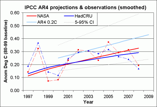 So for 2000-2008, the IPCC smoothed projection was an average of 0.33 deg +/- 0.13 deg (90% confidence interval) above the 1980-99 baseline. Both NASA GISS (0.26 deg) and HADCrut (o.25 deg) were within that range, albeit in the lower part.