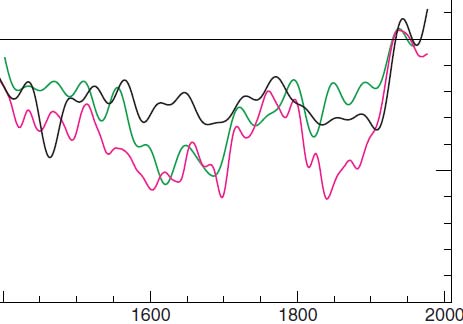 “three northern Eurasian tree ring width chronologies for 1000-1987 (green) from Briffa and Osborn (1999).”