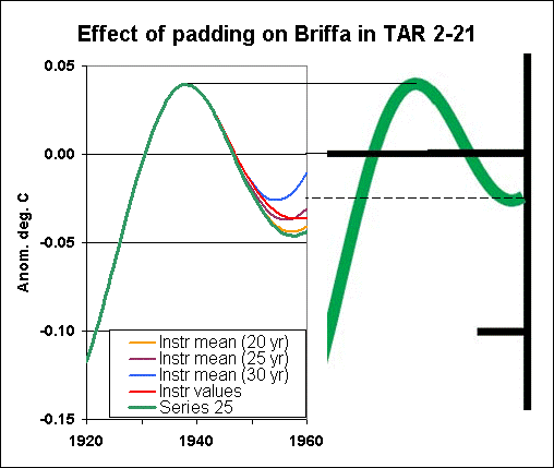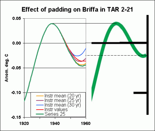 [DC: The problem is that “zero” padding at the modern post-1960 end is very close to some of the other padding alternatives. The “last 25” Briffa series mean (when boosted by the 0.062C offset I used) is -.008C. The 20-year instrumental mean is -0.002C and the 25-year instrumental mean is 0.019C.