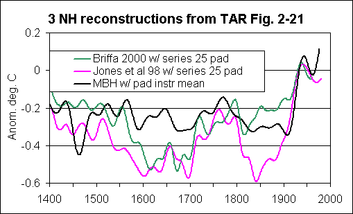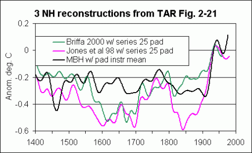 Before diving into the detailed examination of McIntyre’s claims, I’ll briefly describe my emulation of three of the NH reconstructions in TAR 2-21. Here is TAR 2-21 from 1400-2000, showing three key reconstructions, namely Mann et al 1999 (black), Jones et al 1998 (magenta), and Briffa 2000 (green).