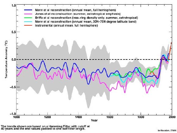 Alert readers will note that the MBH curve is labeled as having been padded with the instrumental mean beyond the end point for purposes of smoothing. This was acknowledged by Mann in a recent comment at RealClimate, where he also explained the rationale for the technique, but noted that he no longer uses the method. However, it is not certain that the padding of the other two data sets was done this way, as explained below.