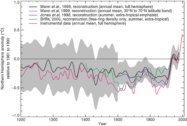 Regular Deep Climate readers will recognize immediately the chart at the centre of all the controversy, namely TAR Figure 2-21 showing various reconstructions of Northern Hemisphere tempearture. Most of the attention has been on a supposed “trick” to “hide the decline” after 1960 in the Briffa 2000 reconstruction, shown in green below. (Because of the oft-discussed “divergence” between temperature and tree-ring density, Briffa himself did not generally show the last 20 years of this reconstruction when using it to show comparative millenial temperature history; neither was post-1960 proxy data used to in the calibration of the reconstruction against the instrumental record.)
