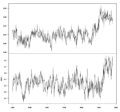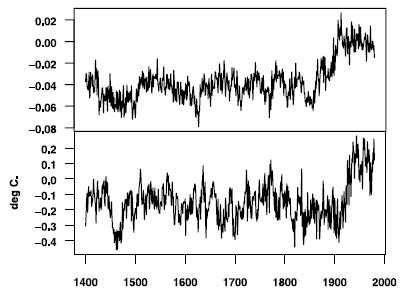In Figure 4.1, the top panel displays PC1 simulated using the MBH98 methodology from stationary trendless red noise. The bottom panel displays the MBH98 Northern Hemisphere temperature index reconstruction.
