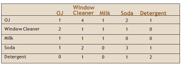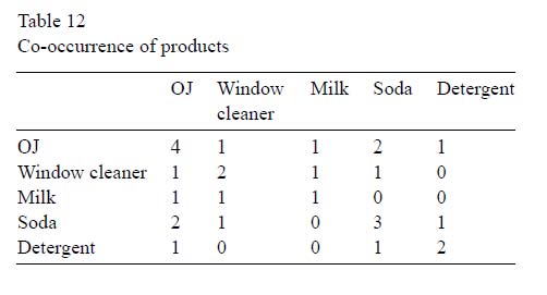 A cursory examination of the co-occurrence table suggest some simple patterns that might be resident in the data. First we note that orange juice and soda are more likely to be purchases together than any other two items. Next we note that detergent is never purchased with window cleaner or milk. Finally we note that milk is never purchased with soda or detergent. These simple observations are examples of associations and may suggest a formal rule like: if a customer purchases soda, then the customer does