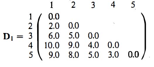 As in previous sections, Wegman and Solka draw heavily on their main source’s specific examples. A worked out example of single linkage agglomerative hierarchical clustering starts from a distance matrix for five data points and works through intermediate steps to arrive at a dendrogram (a chart representing the final hierarchical clustering solution):