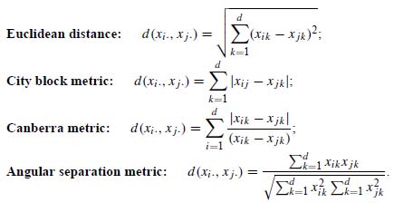 Cluster analysis generally relies on defining similarity (or dissimilarity) between various members of the data collection being analyzed. This can be done by employing one of various available measures of distance between data points. Here is Wegman and Solka’s list of common distance measures used to compute dissimilarity: