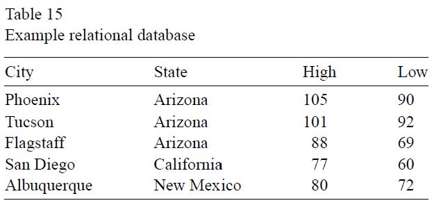 A relational database system contains one or more objects called tables. These tables store the information in the database. Tables are uniquely identified by their names and are comprised of rows and columns. The columns in the table contain the column name, the data type and any other attribute for the columns. We, statisticians, would refer to the columns as the variable identifiers. Rows contain the records of the database. Statisticians would refer to the rows as cases. An example database table is given in Table 15.