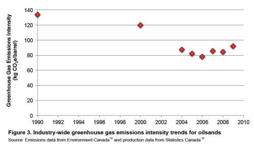 According to Environment Canada’s measurements, the oilsands has reduced its per barrel GHG output by 29% since 1990. Despite massive expansion of oilsands production in the last two decades, Canada’s oil companies have managed to cut their per barrel carbon output by nearly a third. [Bold emphasis added].