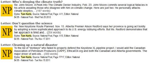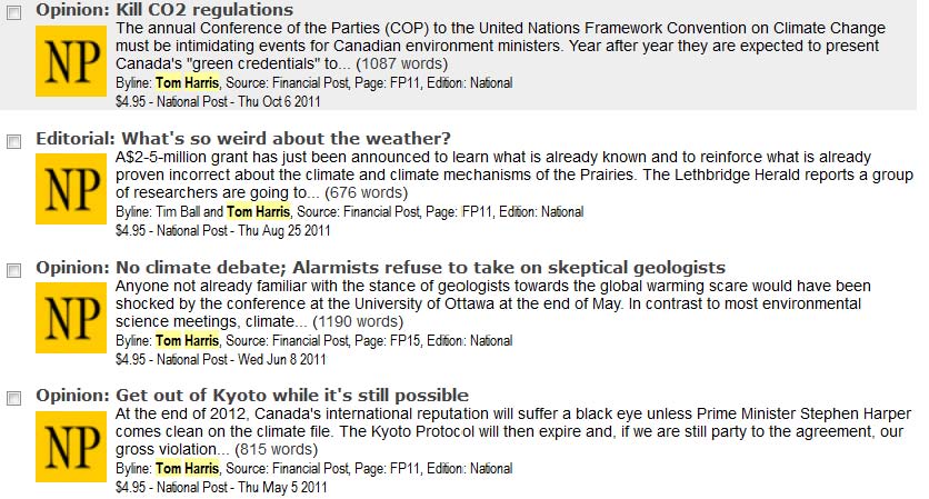 Since National Post editorial brass are presumably aware of Tom Harris’s long hidden but central role in both the Friends of Science and Bali episodes, they will no doubt want to save themselves further embarrassment by revoking, once and for all, the privileged access Harris previously enjoyed. Unfortunately, here the recent record is decidedly mixed, as no fewer than four opinion pieces with Harris’s byline were run in the Financial Post section between May and October of last year.