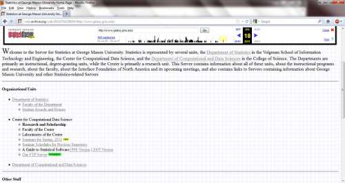 In fact, not only has the Center gone dark, at least on the web, but the erstwhile GMU statistics “Galaxy” server itself has disappeared. Only a year ago, it was billed as the server for “Statistics at George Mason University”. It hosted not only the Center (albeit with badly of date information), but served as a portal to all statistics-related departments at GMU, as well as linking to professional organizations and conferences.