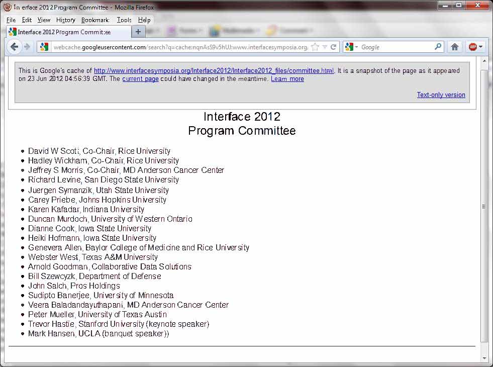 In any event, the 2012 edition of Interface was notable for the complete absence of Wegman for the first time in many years; nor was there anyone else from George Mason University. As he did at WIRES Comp Stat, David Scott was there to pick up the pieces, co-chairing a fine program committee, and hosting the conference at Rice University. By all appearances, the result was a compelling event with the theme of Future of Statistical Computing: Internet Scale Data, Flexible Modeling, and Visualization.
