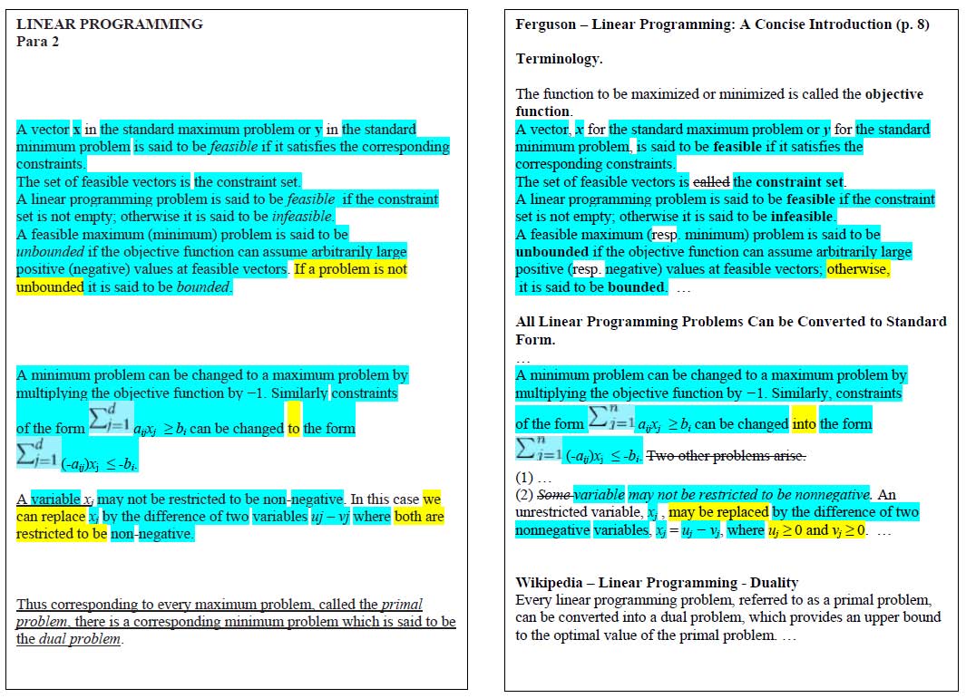 Wiley received complaints concerning both WIREs articles, and dealt with them in a most peculiar way: Wegman and Said were allowed (or allowed themselves) a complete “do over” of each article in turn. Dozens of citations were added, while all traces of previously evident copy-and-paste were scrubbed away. Here’s a small sample comparing a section on linear programming in the original version of Roadmap to Tom Ferguson’s Linear Programming: A Concise Introduction, with the large swathe of identical wording highlighted in cyan, and trivial differences in yellow .
