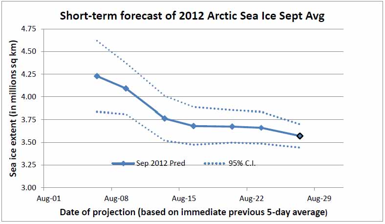 Arctic sea ice continues to melt at a record pace (yesterday’s daily level was at 3.8 million sq km), so the next projection update may be slightly lower. The eventual level will depend largely on when the minimum is actually reached; recent years’ five-day minima have ranged from early September (e.g. 2010) to late September (e.g. 2011). But at this late stage, I would be surprised if the 2012 September average went below 3.4 million sq km (or above 3.7).