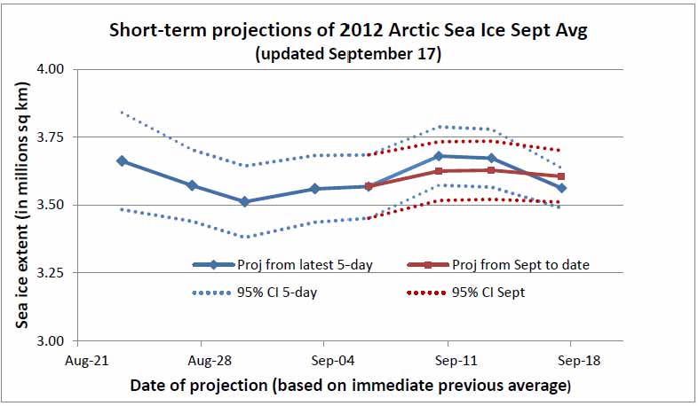 [UPDATE Sept. 18-19: The latest available five-day extent, centred on September 16, is at 3.43 million sq km and rose for the first time in each of the last two days. Thus the minimum may well have been reached on the 5-day average centered on September 14, when extent was 3.41 million sq km. As of September 17, the “5-day” model projects a September average of 3.56 +/- 0.09 million sq km, and the preferred “Sept to date” model projects 3.61 +/- 0.09 million sq km.]