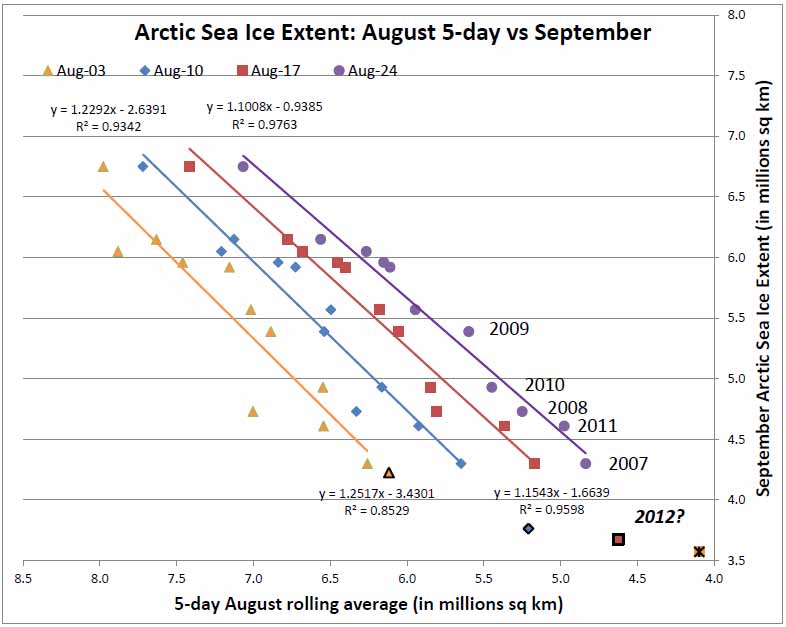 As I discussed in greater detail last time out, these short-term projections are generated by regressing the most recent 5-day sea ice extent level against the eventual September average. This seems to give a very reasonable result, once one is past the first week of August or so. Here are four such projections, with the latest (purple circles) based on the five-day average for August 22-26.